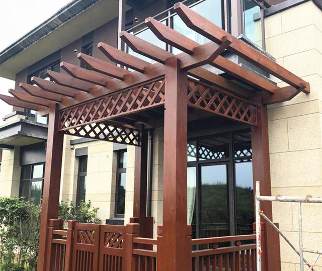 像这样的防腐木结构一般业主的要求都比较高,不只要做的好看,而且涂刷之后的质感,手感,视觉都要比较好。图中的这个类似于防腐木花间的外厅就是使用水性漆加水性色浆涂刷的效果,这个是用喷枪喷涂的。所以看上去颜色较深饱满度好。一般室外要做颜色的话,最好是调好颜色之后用喷枪喷涂一遍或两遍,然后再用透明的水性清漆喷涂一遍。这样做的原因是将颜色做在下面一层,日晒雨淋的环境下能极大的延长颜色的保色性能,不会轻易褪色。